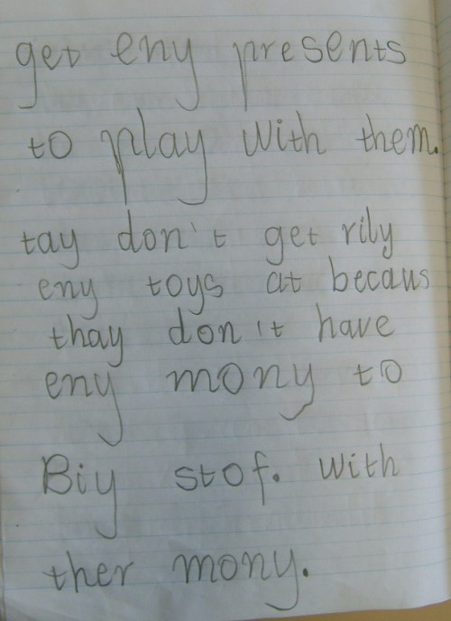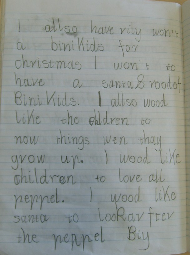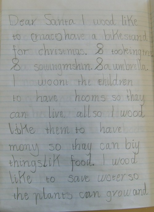 I have many children producing this standard of writing. This student has not checked this draft and will be using our class checklist to make changes over the next few days. The child wrote this in 40 minutes and I was impressed by the content… just so much to say. Oral language development within a Language Experience classroom is the key, combined with the Early Year’s teaching strategies. For international readers, this student will finish their first year of formal schooling this Friday and is 6 years old. I haven’t posted for a while due to reports etc… Hope you enjoy this letter to Santa!