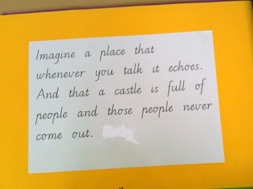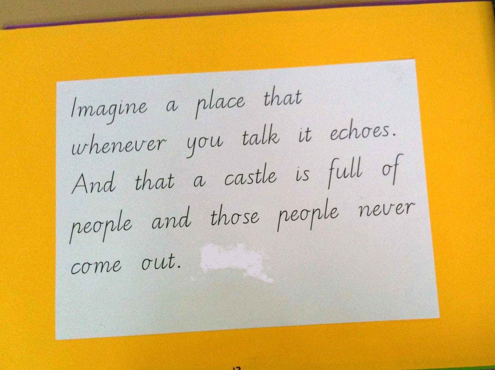 We decided to make our own wonderful book. The children were given an opening phrase – Imagine a place… to scaffold their drawing and writing. They were asked to draw the picture they had of their amazing place in their imagination first. Opening their mind to all the possibilities! They then wrote about their picture starting with the phrase, Imagine a place…. I’ve included photos of my student’s writing and pictures below.