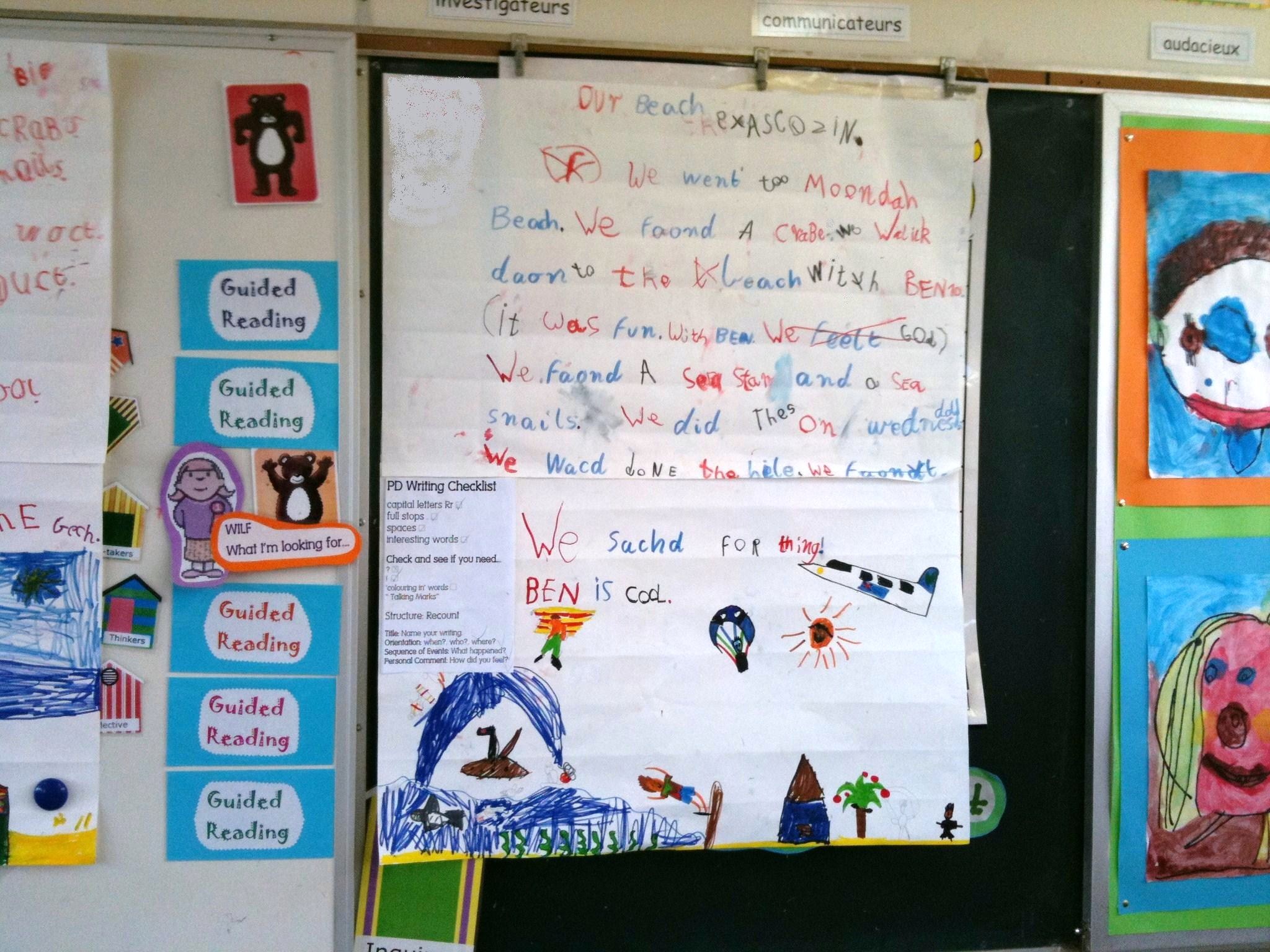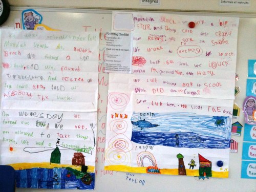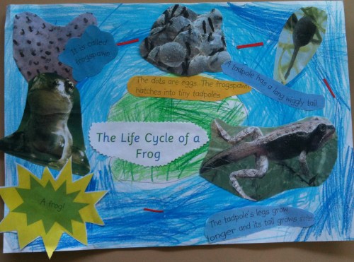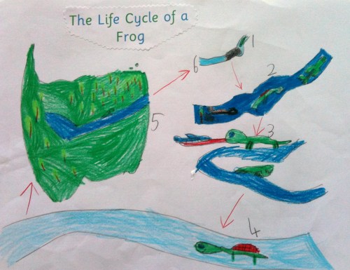 The children were able to look at the books, and I read a selection to the grade. We discussed frogs in general, and then I asked them to draw their own frog life cycle diagram. This was student directed and not teacher modelled.