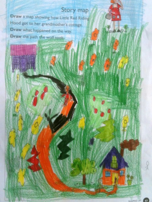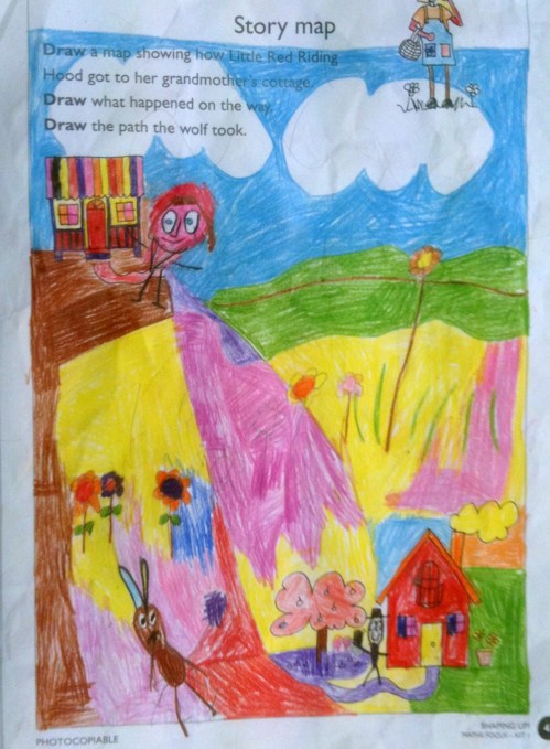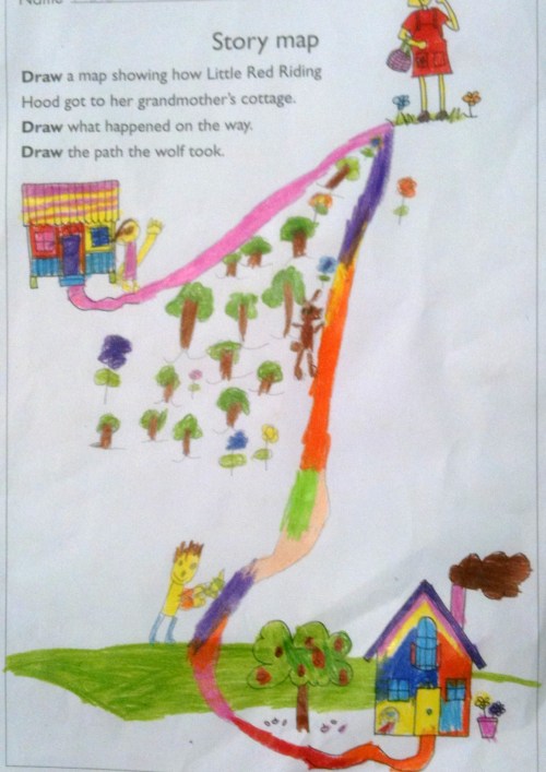 Story Maps are a great comprehension tool for young learners. For this activity the children were read Little Red Riding Hood. These children were familiar with the text, having heard the story before. After reading the story to the children as a written text, not as a picture story book, the children were asked to draw a detailed map of Red Riding Hood’s journey representing the main parts of the story.