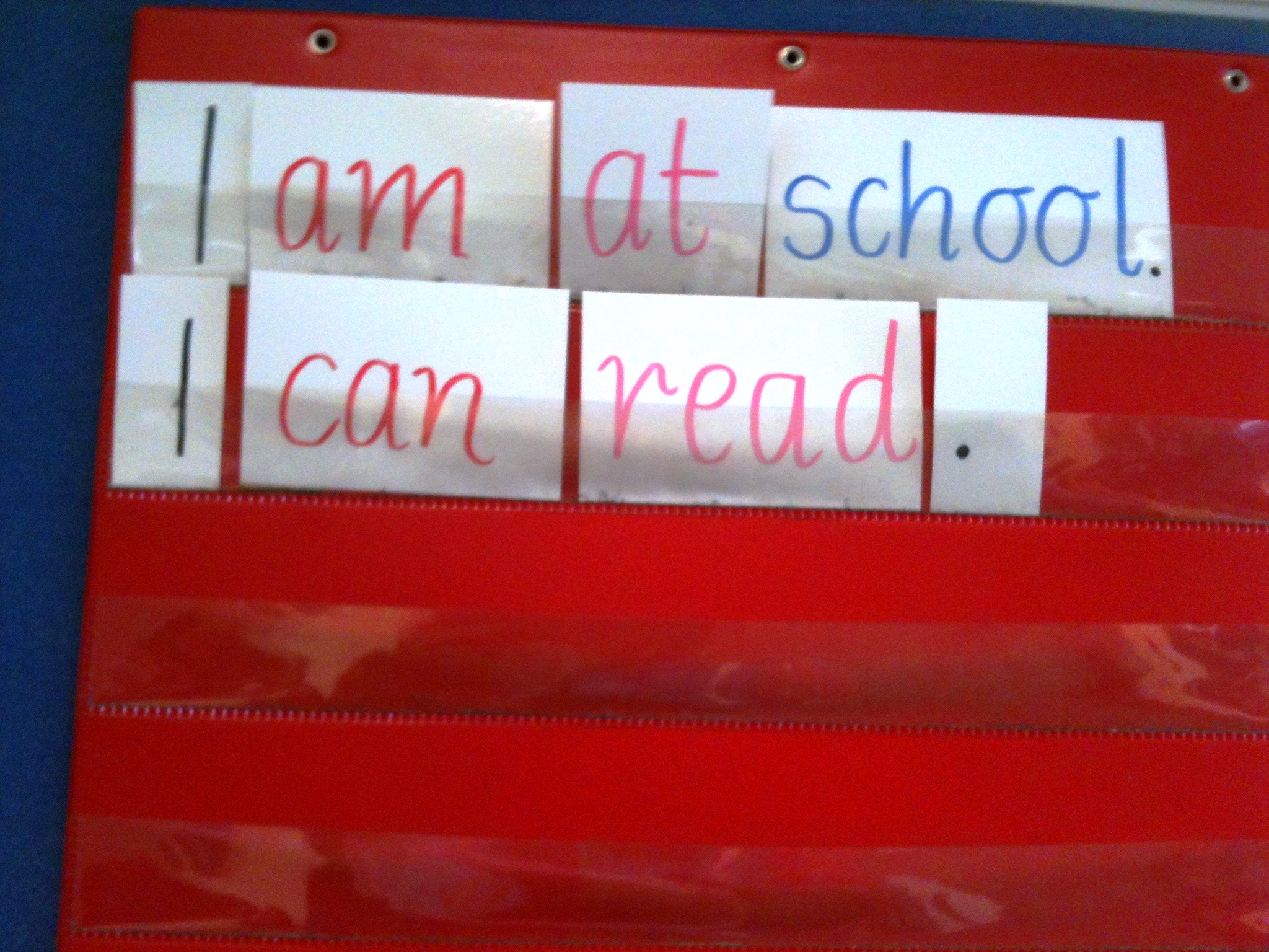 Our first sentence is written on sentence strips and placed in the sentence board and on the velcro board. We read our sentence, sound words and the children illustrated the sentence on a sheet they take home to read to their parents.