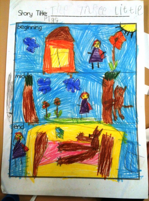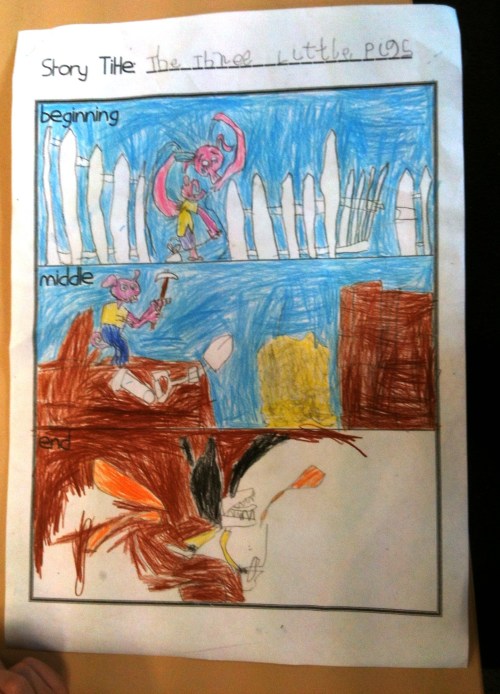 The narrative has a beginning, middle, end, problem and resolution. Using a fairy tale works well beacause the children are familiar with the story and this is important. They were read two stories and were able to choose which story they liked best.
