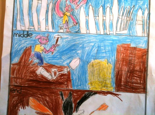 After our whole class discussion I opened the book to a page where a school boy is walking down a path way, but it is unclear exactly what he is doing (for those who are not familiar with the book, it has no words).